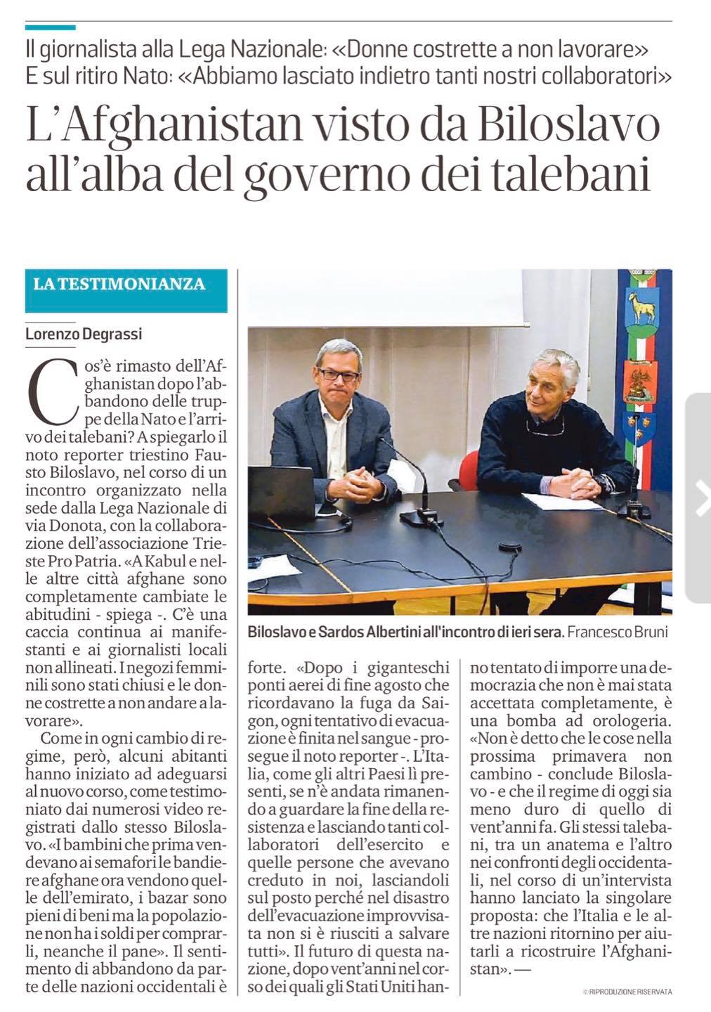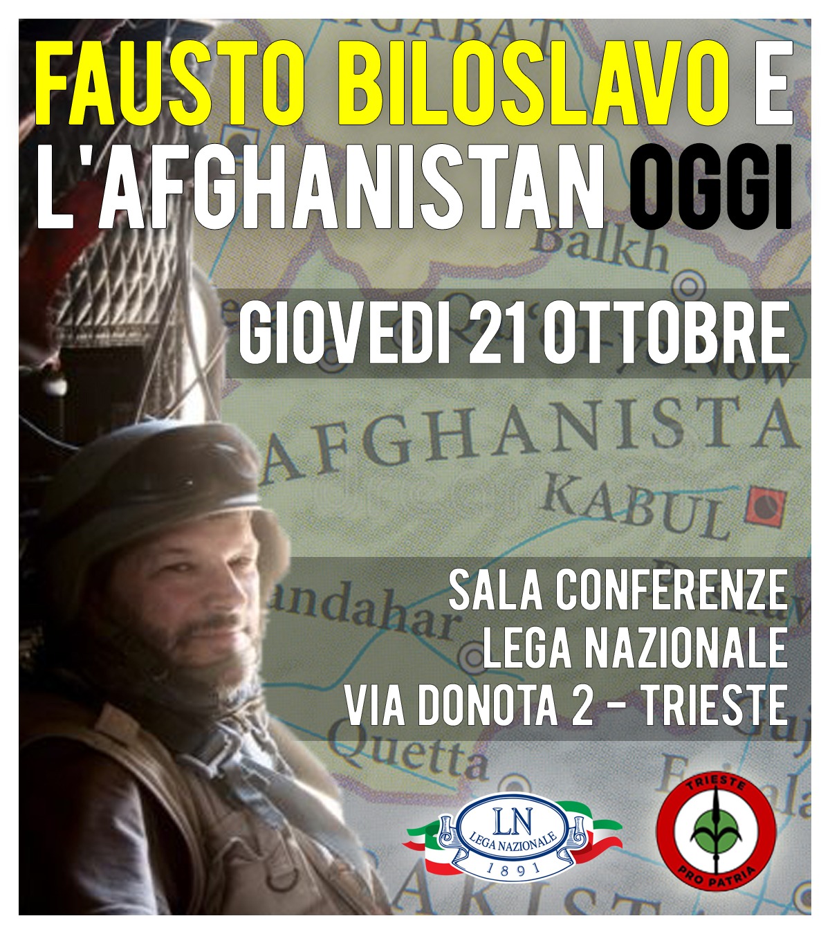 La Lega Nazionale è lieta di invitarvi al prossimo evento che si terrà nella sede sociale di via Donota 2 il giorno 21 ottobre alle ore 18.30. Protagonista il giornalista Fausto Biloslavo e le recenti vicende in Afghanistan. Partecipate numerosi!