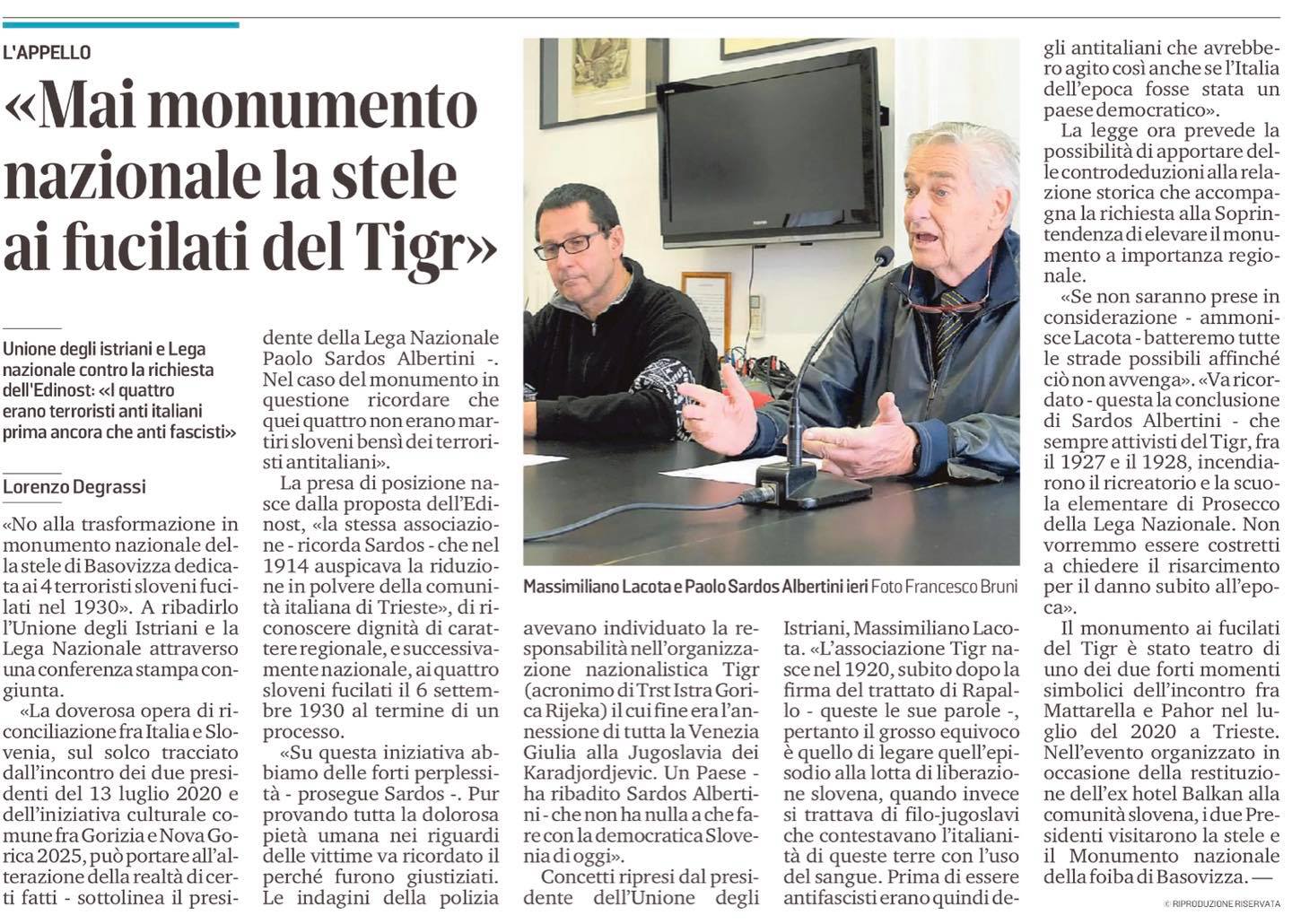 La Lega Nazionale e l’Unione degli Istriani hanno tenuto una conferenza stampa congiunta per ribadire che la stele commemorativa dei quattro terroristi anti italiani del TIGR NON diventi monumento nazionale. Una battaglia da portare avanti assieme a tutte le associazioni e a tutti gli italiani.
